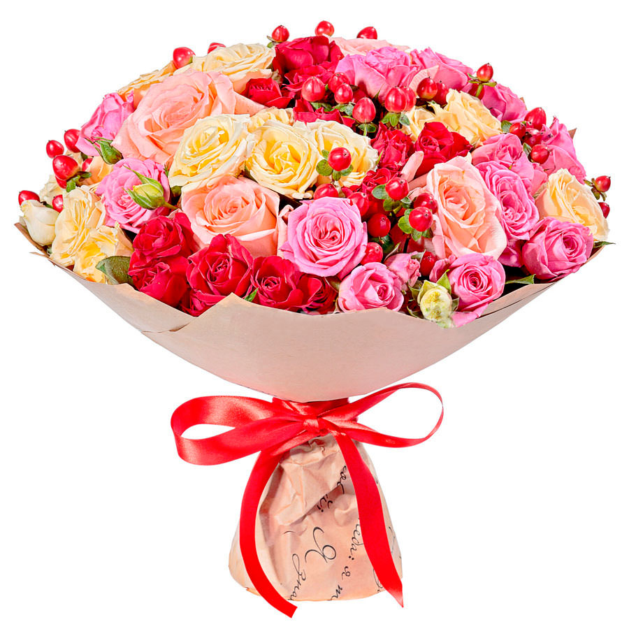 На фото представлен образец. Объем букета зависит от выбранного вами размера. Точное количество цветов и цветовую гамму вы можете уточнить у менеджера по телефону.